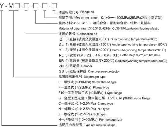 | 標示:通用儀表為YSZ-XB(LED)數顯壓力變送器,隔離器連接形式為直接,采用MN螺母式,隔離器材料為SUS316,膜片材料為哈氏C; 測量范圍為0~1.6MPa,法蘭規格為DN40. YSZ-XB(LED)-MN-哈氏C-1.6MPa-DN40 標示:通用儀表為不銹鋼壓力表,隔離器連接形式為直接,采用MS全塑工型法蘭, 材料為PVC, 膜片材料:聚四氟乙烯,測量范圍為0~0.6Mpa,工型法蘭規格為DN25。 Y100BF-MS-PTFE-0.6MPa-DN25 | |