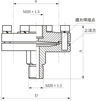 該型是膜片直接與上法蘭焊接在一起(見右圖)。其用途: 1、適用16~100MPa中高壓范圍壓力測量。 2、適用拆卸清洗,可用于介質中有固體浮物且易沉積的場合。 d D A 測量范圍 φ68 φ95 75 16MPa φ58 φ91 75 25~60MPa φ46 φ80 72 100MPa | ![]() |