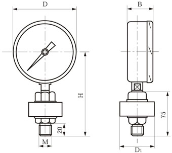 | 外形尺寸 型號 D B H D1 M 0.1~2.5MPa 4~25MPa 螺栓壓膜片式 Y100-ML 100 42 149 95 91 M20×1.5 G1/2" 1/2NPT Y150-ML 150 48 179 95 91 螺紋壓膜片式 Y100-ML 100 42 149 78 48 Y150-ML 150 48 179 78 48 | |